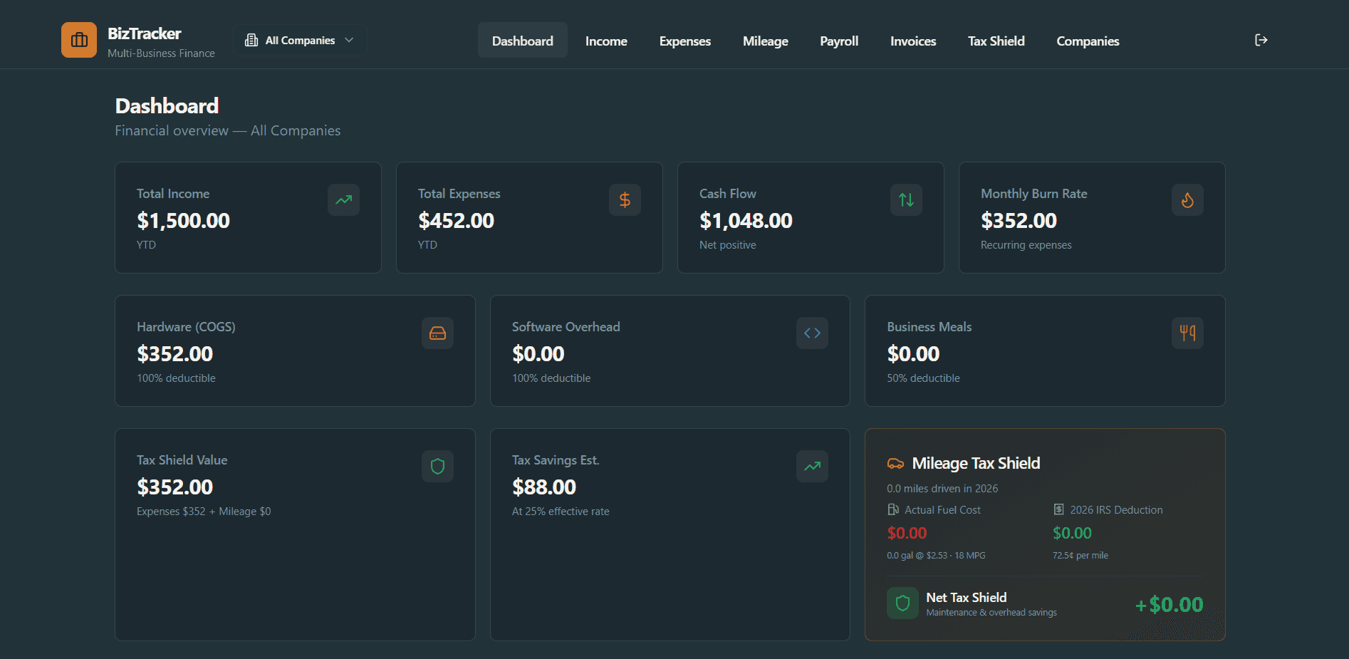 We engineered the Business Tracker Module as a high-performance Progressive Web App (PWA) that handles complex calculations without the bloat of standard SaaS tools. This digital equipment tracks hardware costs and software overhead with a dedicated Tax Shield engine. It runs smoothly on any mobile device even when you are moving between job sites.